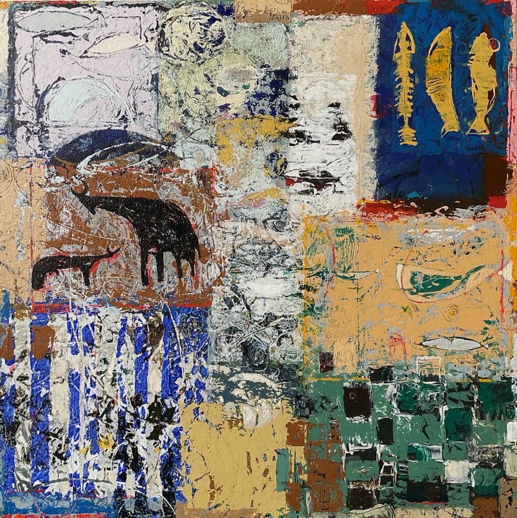 ADDIS GEZEHAGN : FLOATING 1, 2024 | 18” x 18” | Acrylic and Paper on Canvas