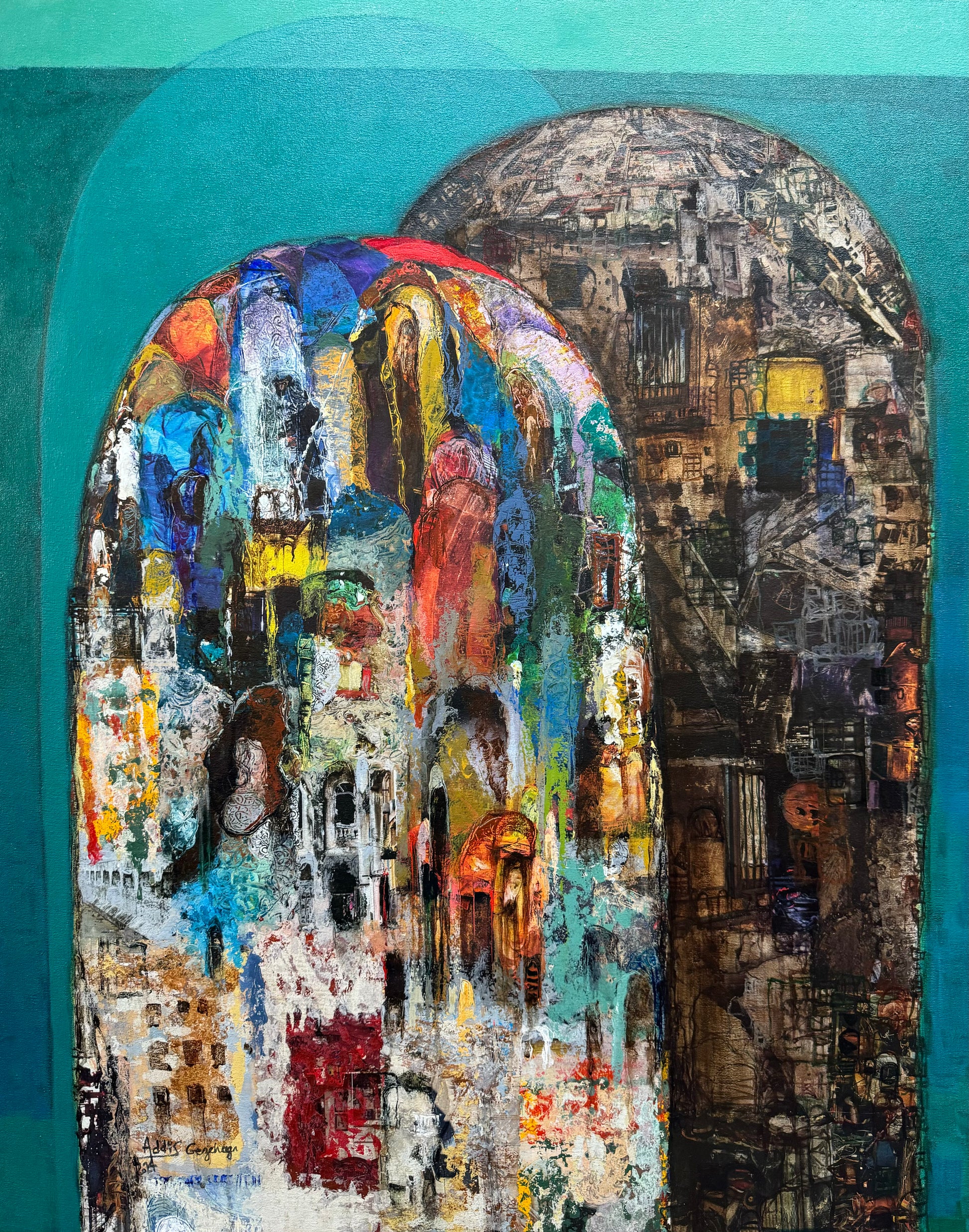 ADDIS GEZEHAGN : FLOATING TOWER, 2024 | 36” x 36” | Acrylic and Paper on Canvas